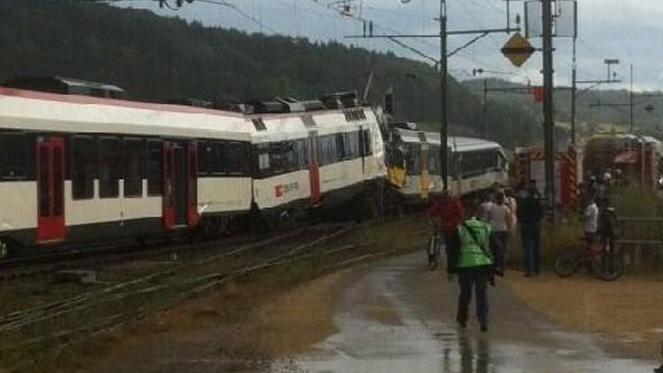 Околу 40 луѓе се повредени, од кои четворица посериозно, при судир на два воза што се случи во Швајцарија, јави АФП, повикувајќи се на швајцарската телевизија. Два воза се судриле директно во 19 часот по локално време во швајцарскиот кантон Гранж-пре-Марнан, во близина на градот Лозана, во западниот дел на земјата.