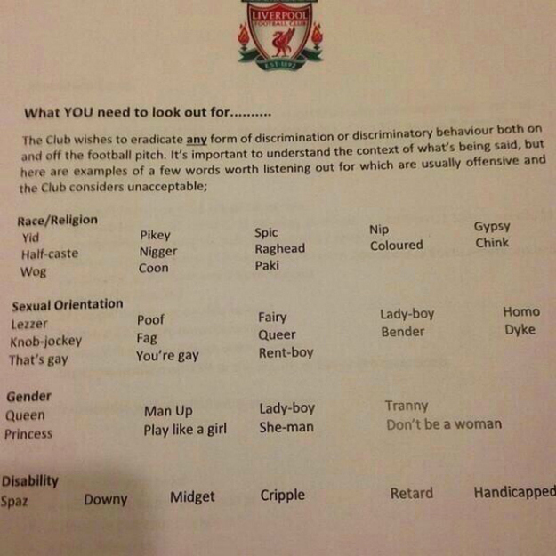 Минатата година напаѓачот на Ливерпул, Луис Суарез, неколку пати го нарече „црнец“ фудбалерот на Манчестер јунајтед, Патрис Евра, по што заработи суспензија од осум меча неиграње. Суарез тврдеше дека тоа не било навредлив израз во неговата земја, па клубот реши да им достави на своите играчи листа на зборови што се сметаат за несоодветни по расна основа, како и сексуална или полна дискриминација.