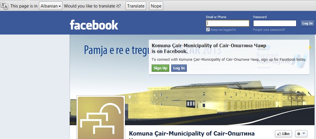 Општина Чаир на македонски единствено е присутна на фејсбук страницата на општината но и таму само во називот.