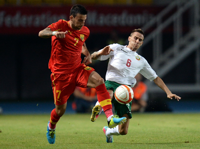 Bulgarian player Minev Jordan (R) vies for the ball with Macedonian player Ivan Trichkovski (L) at the Filip II Arena in Skopje,The Former Yugoslav Republic of Macedonia on 14 August 2013 during the friendly soccer match between Macedonia and Bulgaria.