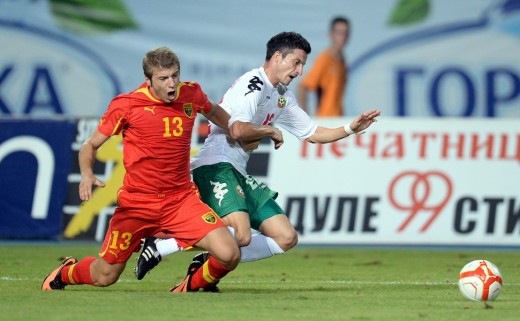 Bulgarian player Stanislav Manolev (R) fouls for penalty Macedonian player Stefan Ristovski (L) at the Filip II Arena in Skopje,The Former Yugoslav Republic of Macedonia on 14 August 2013 during the friendly soccer match between Macedonia and Bulgaria.