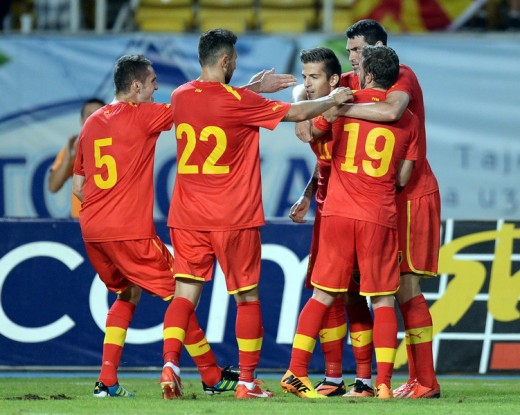 Macedonian players hug their teammate Aleksandar Trajkovski after he scores second goal against Bulgaria at the Filip II Arena in Skopje,The Former Yugoslav Republic of Macedonia on 14 August 2013 during the friendly soccer match between Macedonia and Bulgaria.