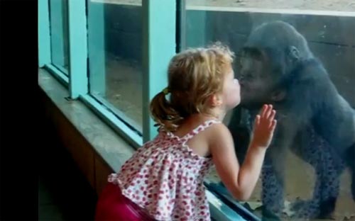 Несекојдневен бакнеж меѓи едно девојче посетител во зоолошката градина во Сиднеј и мајмунот зад стаклениот кафез ги воодушеви посетителите. На снимката која стана вистински хит на Јутјуб, е прикажана интересна игра на девојче со горила, кои во еден момен се бакнаа преку стаклото.