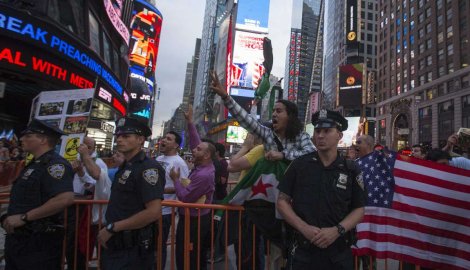 Синоќешните протести во Њујорк собраа луѓе кои ја поддржуваат власта на Башар ал Асад, оние кои се противат на интервенцијата на САД, како и оние кои истакнуваат дека едноставно не можат да поднесат уште една војна. Демонстрантите извикуваа: „САД, НАТО – рацете подалеку од Сирија!“, некои носеа фотографија на Асад, а некои едноставно го изразуваа противењето на новата војна.