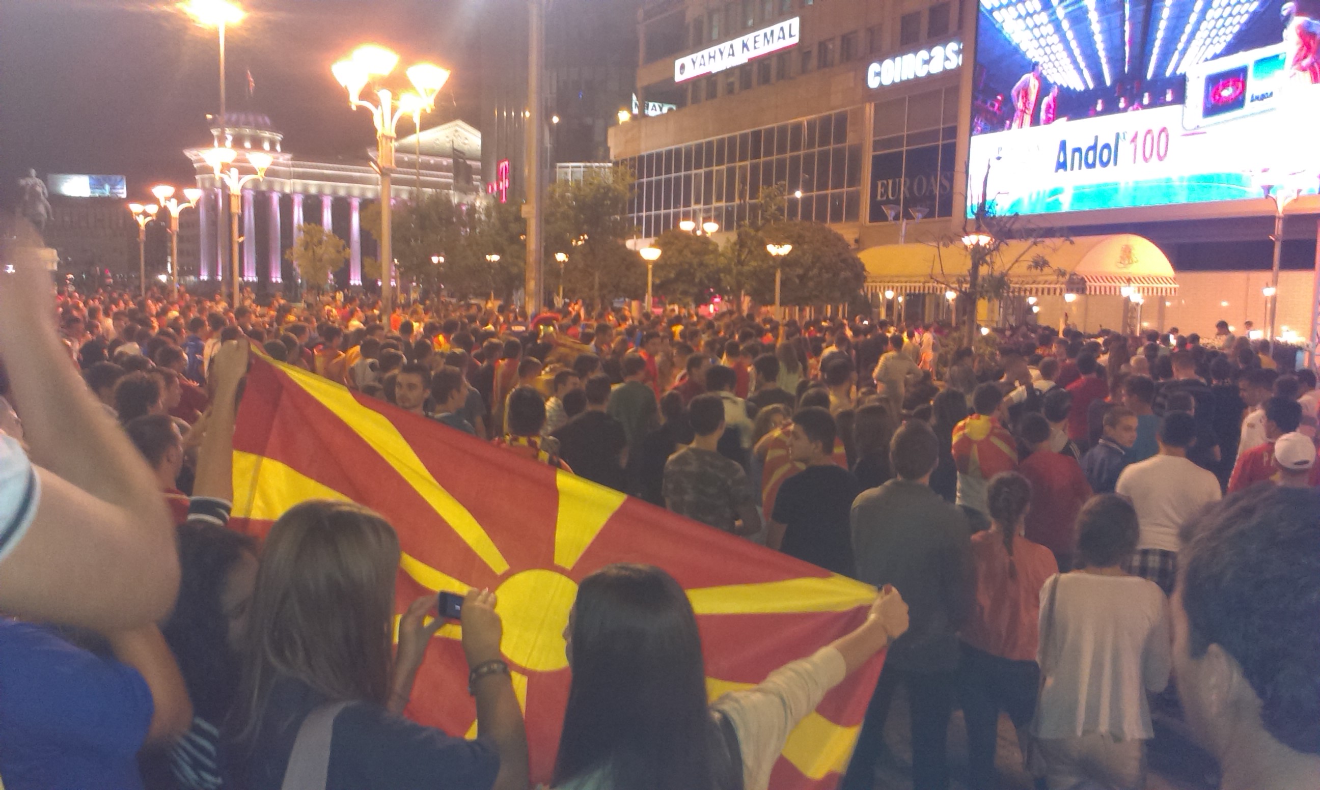 Радосни по големата победа на фудбалерите над репрезентацијата на Велс, Македонците сега се собраа на скопскиот плоштад заедно да го проследат натпреварот против Србија.