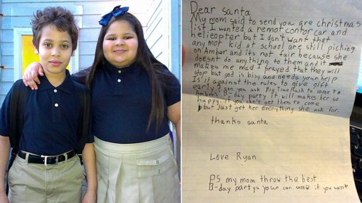 Самохраната мајка Карен Саферн им кажала на нејзините осумгодишни близнаци да напишат писмо до Дедо Мраз сп нивните желби за Божиќ. Наместо играчки, облека или компјутер, на листата на нејзиниот син Рајан пронашла нешто друго.