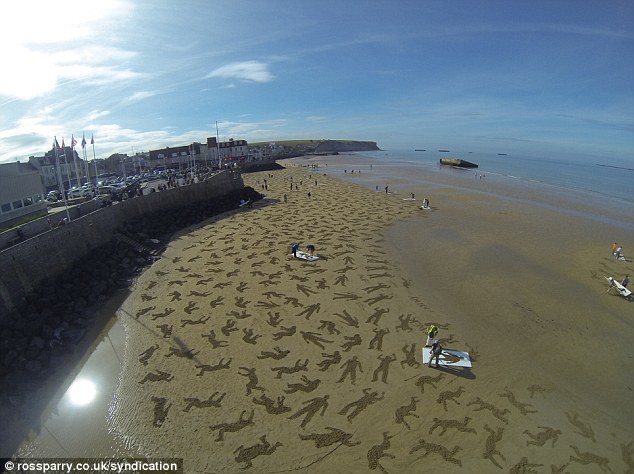 Заедно со тим на волонтери, парот отпатува за Ароманчес плажата, Нормандија, за да направат силуети, кои индивидуално беа вовлечени во песокот.