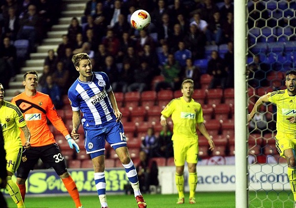 Лош ден на голот на словенечкиот првак Марибор имаше Јасмин Хандановиќ, а двете негови грешки му помогнаа на Виган да слави со 3-1. Најпрво чуварот на мрежата на гостите лошо ја избоксува топката и му остави зицер на Пауел, кој погоди со глава за 1-0, а потоа Хандановиќ уште еднаш имаше лоша проценка при голот на Вилсон за предност на Англичаните од 2-0. Натпреварот заврши со победа на Виган од 3-1.