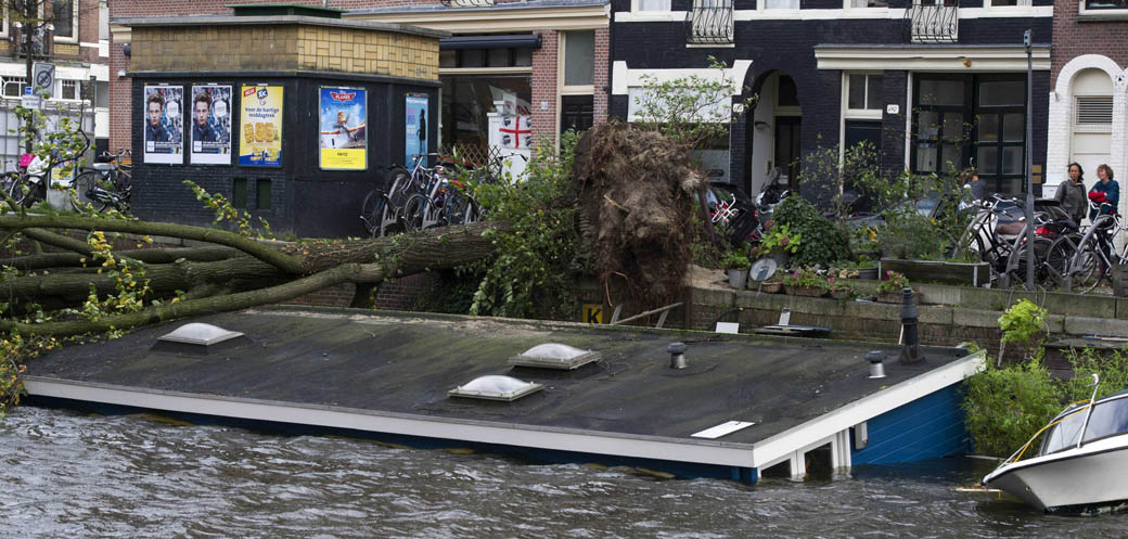 epa03928183 An uprooted tree has fallen on a houseboat at the Jacob van Lennepkade canal in Amsterdam, The Netherlands, 28 October 2013. According to reports, a woman was killed by the fallen tree. So far, at least three people have been killed by falling trees in England and the Netherlands as a powerful storm continued to wend its way up both sides of the Channel, disrupting life in large parts of Britain and continental Europe. EPA/EVERT ELZINGA