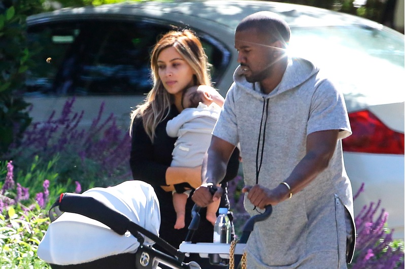 33-годишната Ким без шминка уште еднаш ја покажа природната убавина која дополнително ја посочи со бебето во нејзините раце, а Канје како прав татко ја буткаше количката покрај неговата девојка.