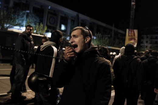epa03954309 A protester shouts slogans through a megaphone in front of the US Embassy during a demonstration marking the 40th anniversary of the 1973 uprising that was brutally crushed by the military junta ruling Greece at the time, in Athens, Greece, 17 November 2013. Thousands of Greeks marched in an annual rally to commemorate a 1973 student uprising that led to the overthrow of a military dictatorship. EPA/ALKIS KONSTANTINIDIS EPA/ALKIS KONSTANTINIDIS