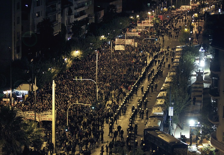 epa03954381 Protesters march in front of the US Embassy during a demonstration in Athens, Greece, 17 November 2013, marking the 40th anniversary of the 1973 uprising that was brutally crushed by the military junta ruling Greece at the time. Thousands of Greeks marched in an annual rally to commemorate a 1973 student uprising that led to the overthrow of a military dictatorship. EPA/SIMELA PANTZARTZI