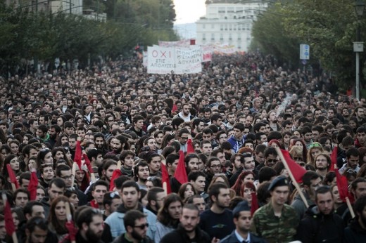 epa03954210 Protesters march during a demonstration in Athens, Greece, 17 November 2013, marking the 40th anniversary of the 1973 uprising that was brutally crushed by the military junta ruling Greece at the time. Thousands of Greeks marched in an annual rally to commemorate a 1973 student uprising that led to the overthrow of a military dictatorship. EPA/ORESTIS PANAGIOTOU