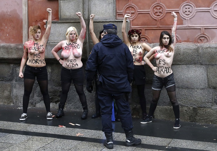 epa03953849 A police officer approaches Femen activists with slogans on their body reading (L-R) ‘My body, My rules’, ‘Back off, pro life’, ‘Stay away from my pussy’, and ‘Abortion is sacred’ as they protest against the so-called ‘March for Life’ rally organized by the platform The Right to Live during a protest in Madrid, Spain, 17 November 2013. Femen activists defended the women’s right to choose the abortion as an option, challenging the march that defends the ban to abort. EPA/JUAN CARLOS HIDALGO