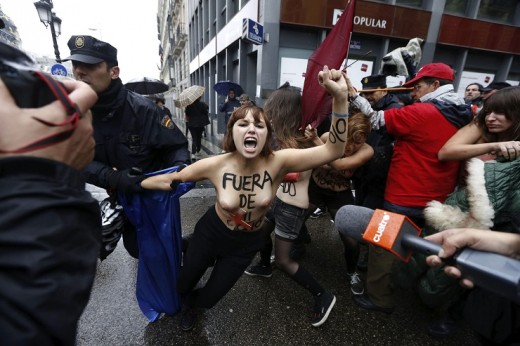 epa03953814 Femen activists are attacked by participants of the so called ‘March for Life’ organized by the platform The Right to Live during a protest in Madrid, Spain, 17 November 2013. Femen activists defended the women’s right to choose the abortion as an option, challenging the march that defends the ban to abort. EPA/JUAN CARLOS HIDALGO