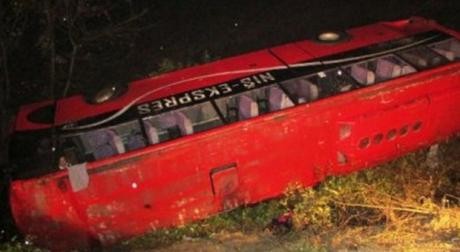 Автобус на „Ниш-експрес“ синоќа се преврти во Србија, при што се повредени 17 патници. Најверојатно до несреќата дошло поради неприспособената брзина на возење на влажниот коловоз, при што автобусот се лизнал, се превртел и слетал во канал длабок шест метри.