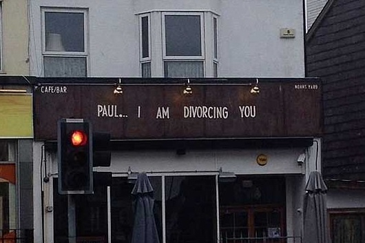 Налутената жена го замолила вработениот во барот Ноахс Јард да постави напис на кој што пишувало: „Пол, се разведувам од тебе. Ќе го задржам кучето!“