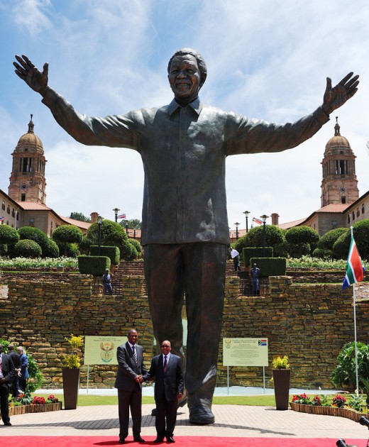 epa03993040 Dignitaries pose for the media after unveiling a nine meter bronze statue of the late Nelson Mandela as part of the Day of Reconciliation celebrations at the Union Buildings in Pretoria, South Africa, 16 December 2013. The day also marks the commemoration of the centenary of the Union Buildings, one of the most iconic structures in South Africa. Late former South African president Nelson Mandela was buried at his home village of Qunu on 15 December. EPA/STRINGER