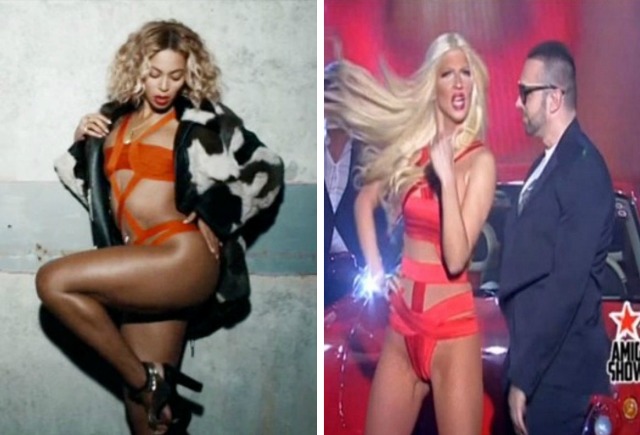 Светло-црвениот костими направен само од ленти Јелена Карлеуша го покажа уште во април оваа година, кога ја промовираше нејзината нова песна „Ferari“, додека пак Бијонсе со идентичен костим се појави во нејзиниот најнов видео спот за песната „Yonce“.
