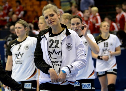 epa03995535 German player Susann Muller reacts after her team lost the quarter final match between Denmark and Germany of the Women Handball World Championship in Novi Sad, Serbia, 18 December 2013. EPA/GEORGI LICOVSKI