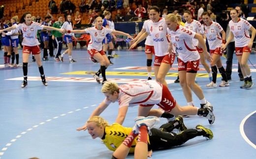 epa03995352 Polish playes celebrate their team’s victory after the quarter final match between Poland and France of the Women Handball World Championship in Novi Sad, Serbia, 18 December 2013. EPA/GEORGI LICOVSKI