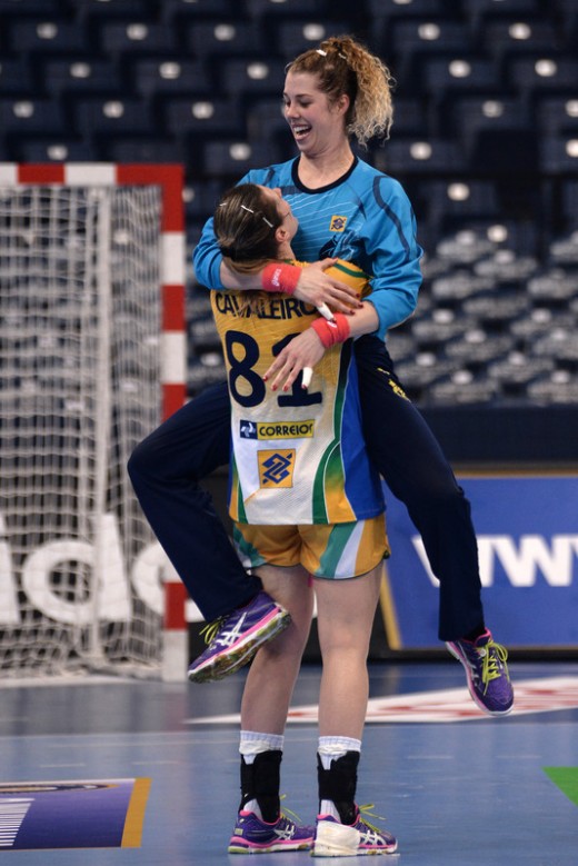 epa03997609 Brazil goalkeeper Barbara Arenhart (R) and her teammate Deonise Cavaleiro (L) celebrate their team victory at the semi – final match between Brazil and Denmark of the Women Handball World Championship in Belgarde, Serbia, 20 December 2013. EPA/GEORGI LICOVSKI