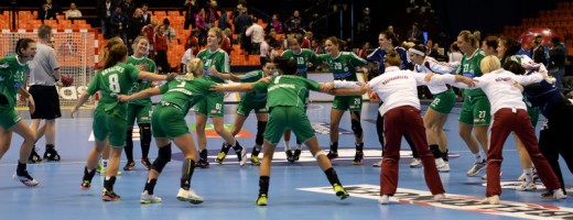 epa03993458 Hungarian players celebrate after their victory in the eighth-final match between Hungary and Spain of the Women Handball World Championship in Novi Sad, Serbia, 16 December 2013. EPA/GEORGI LICOVSKI