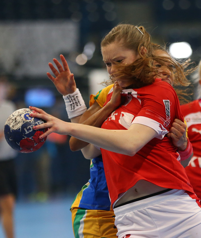 epa03997573 Anne Mette Hansen (front) of Denmark vies for the ball with Alexandra Nascimento (back), of Brazil during the semi-final match between Brazil and Denmark at the Women Handball World Championship in Belgrade, Serbia, 20 December 2013. EPA/KOCA SULEJMANOVIC