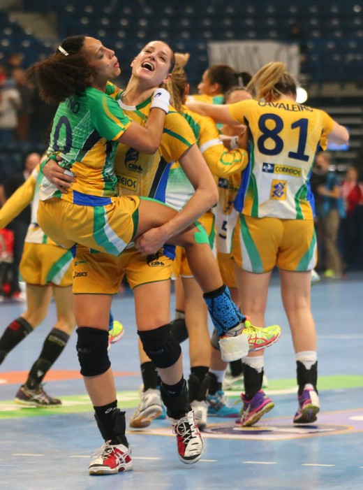 epa03997596 Players of Brazil celebrate after winning the semi-final match between Brazil and Denmark at the Women Handball World Championship in Belgrade, Serbia, 20 December 2013. EPA/KOCA SULEJMANOVIC