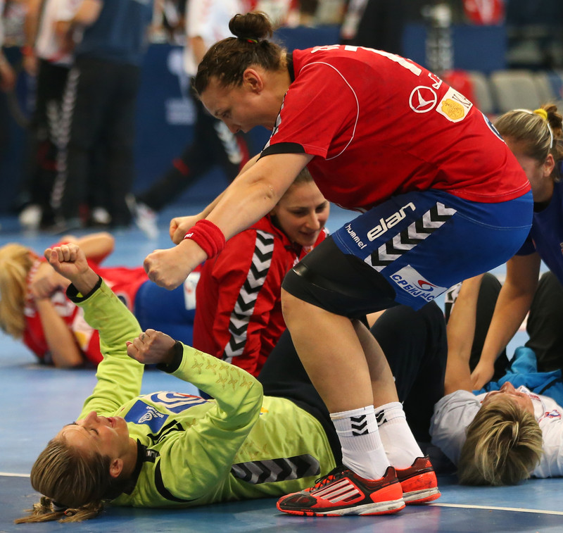 epa03997439 Katarina Tomasevic (down) and Dragana Cvijic (up) of Serbia celebrate after winning against Poland at the Women Handball World Championship in Belgrade, Serbia, 20 December 2013. EPA/KOCA SULEJMANOVIC