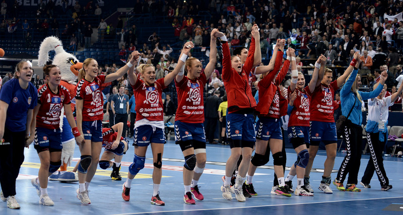epa03997440 Serbian players celebrate their team victory after the semi – final match between Poland and Serbia of the Women Handball World Championship in Belgrade, Serbia, 20 December 2013. EPA/GEORGI LICOVSKI