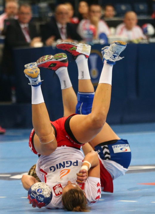 epa03997411 Iwona Niedzwiedz (front) of Poland vies for the ball with Svetlana Ognjenovic (back) of Serbia during the match between Poland and Serbia at the Women Handball World Championship in Belgrade, Serbia, 20 December 2013. EPA/KOCA SULEJMANOVIC