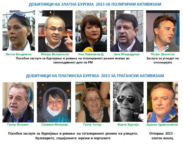 Екслидерот на СДСМ, Брано Црвенковски, се појави во јавност за да ја прими наградата златен венец за Отпораш во 2013 година. На „јутјуб“ се појави видео на кое се појавуваат добитниците на наградите „Бургијаш на годината”. На свеченоста која се одржала на 24 декември. Платинска Бургија, покрај Црвенковски, добија и Ѓунер Исмаил, Силвана Митрева, Борче Бургија и Ѓулче Астор. Тие се наградени за посебни заслуги за бургијање и ровање. Птре Шилегов, Јани Макрадули, Весна Бендевска, Ана Павловска – Данева и Митре Вељановски.