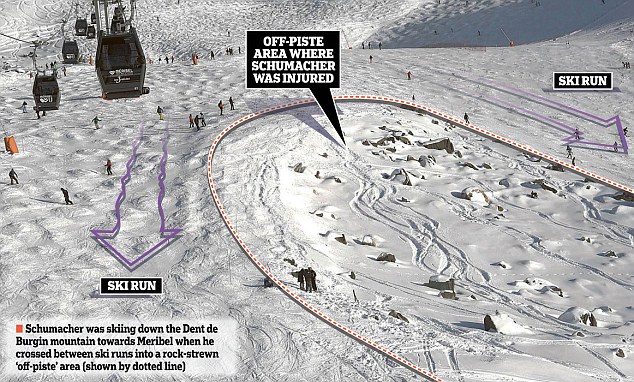 Местото каде што асот во Формула 1, Михаел Шумахер, падна и се повреди е надвор од предвидените патеки за скијање во познатиот центар Мерибел во Франција.