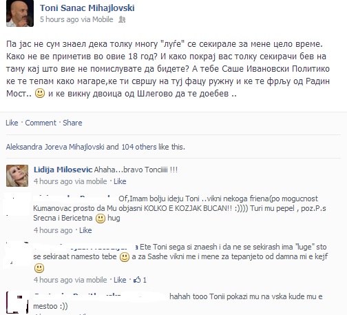 По последното издание на „Опуштено“ во кое гостуваше премиерот Никола Груевски, едни го критикуваа, други го фалеа македонскиот актер и водител на шоуто – Тони Михајловски. Според едни е „улизување“, според други е интересно и оригинално. Го критикуваа политичари и колеги, но сите се обединети во едно – нападите кон Саше Политико, кој на за него сосема својствен начин, но несвојствен за еден медиум, напиша еден свој текст за последното издание на „Опуштено“.
