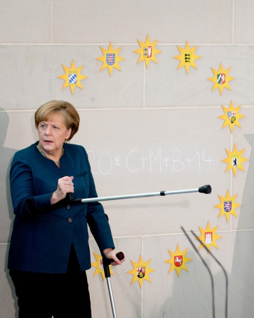 epa04010941 German Chancellor Angela Merkel points with one of her crutches as she receives epiphany singers from each of the 27 German dioceses at the Federal Chancellery in Berlin, Germany, 07 January 2014. Merkel recently suffered injury in a skiing accident. EPA/KAY NIETFELD