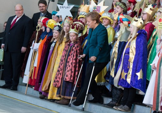 epa04010933 German Chancellor Angela Merkel (C) walks on crutches as she receives epiphany singers from each of the 27 German dioceses at the Federal Chancellery in Berlin, Germany, 07 January 2014. Merkel recently suffered injury in a skiing accident. EPA/BERND VON JUTRCZENKA
