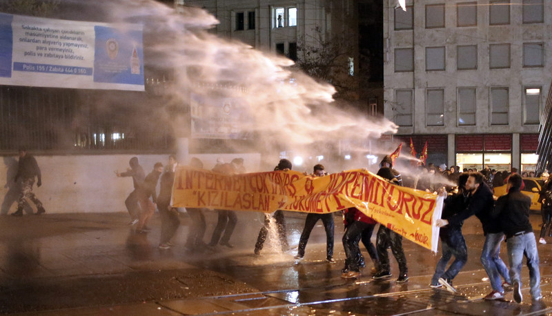 Турската полиција со солзавец и водени топови ги растера демонстрантите на централниот плоштад Таксим во Истанбул. Синоќа околу две илјади учесници протестираа против владиниот нацрт-закон, со кој ќе се зголеми контролата врз интернетот.