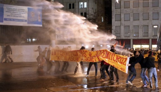 epa04029127 Turkish riot police sprays water on protestors holding a banner during an anti-government rally in Istanbul, Turkey, 18 January 2014. Hundreds of protestors gathered for a protest to denounce the Turkish parliament’s adoption of a new law that will allow further limitations on the Internet. EPA/SEDAT SUNA