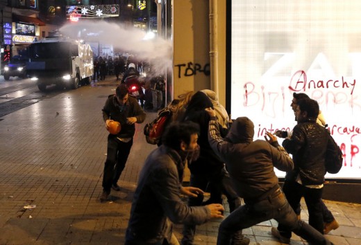 epa04029189 Turkish riot police uses a water cannon vehicle to disperse protestors during an anti government protest in Istanbul, Turkey, 18 January 2014. Hundreds of protestors gathered for a protest to denounce the Turkish parliament’s adoption of a new law that will allow further limitations on the Internet. EPA/TOLGA BOZOGLU