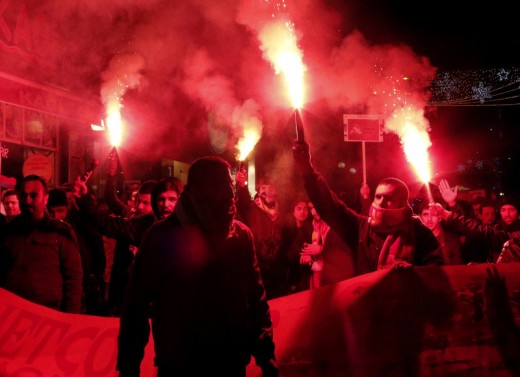 epaselect epa04029129 Turkish protestors carry flares while shouting slogans during an anti-government rally in Istanbul, Turkey, 18 January 2014. Hundreds of protestors gathered for a protest to denounce the Turkish parliament’s adoption of a new law that will allow further limitations on the Internet. EPA/SEDAT SUNA