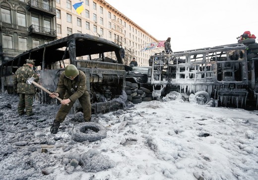 epa04038469 A protester removes ice from a tire as a temporary truce with riot police was called during an anti-government protest in downtown Kiev, Ukraine, 23 January 2014. At least two people died of gunshot wounds on 22 January during anti-government protests in Ukraine, prosecutors said. A demonstrator also reportedly fell to his death after being chased by police. The violent protests have been raging in the Ukrainian capital since 19 January. EPA/SERGEY DOLZHENKO