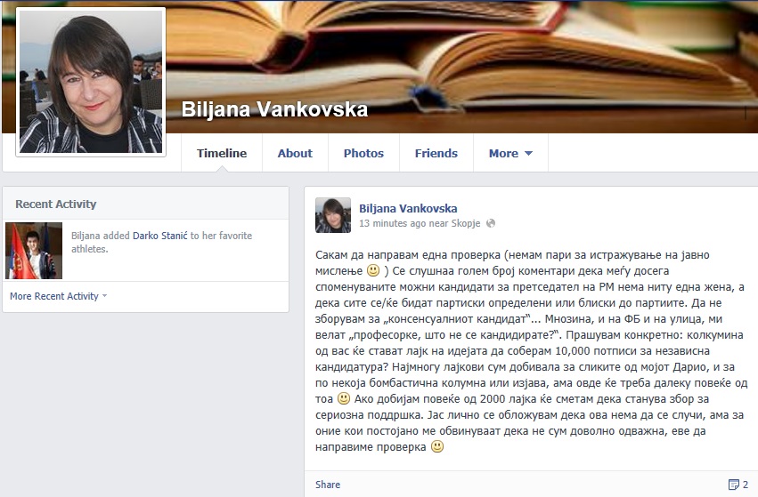 Сакам да направам една проверка (немам пари за истражување на јавно мислење ) Се слушнаа голем број коментари дека меѓу досега споменуваните можни кандидати за претседател на РМ нема ниту една жена, а дека сите се/ќе бидат партиски определени или блиски до партиите. Да не зборувам за „консенсуалниот кандидат“… Мнозина, и на ФБ и на улица, ми велат „професорке, што не се кандидирате?“. Прашувам …конкретно: колкумина од вас ќе стават лајк на идејата да соберам 10,000 потписи за независна кандидатура? Најмногу лајкови сум добивала за сликите од мојот Дарио, и за по некоја бомбастична колумна или изјава, ама овде ќе треба далеку повеќе од тоа. Ако добијам повеќе од 2000 лајка ќе сметам дека станува збор за сериозна поддршка. Јас лично се обложувам дека ова нема да се случи, ама за оние кои постојано ме обвинуваат дека не сум доволно одважна, еве да направиме проверка.