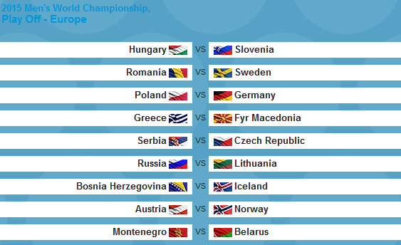 Австрија – Норвешка, Унгарија – Словенија и Црна Гора – Белорусија се меѓу паровите кои денеска беа извлечени во ждрепката за пласман на светското првенство во Катар 2015 година.
