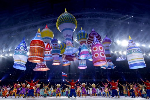 epa04060292 Dancers perform among large helium inflatables creating the elements of St. Basil’s cathedral during the Opening Ceremony of the Sochi 2014 Olympic Games at the Fisht Olympic Stadium, Sochi, Russia, 07 February 2014. EPA/HOW HWEE YOUNG