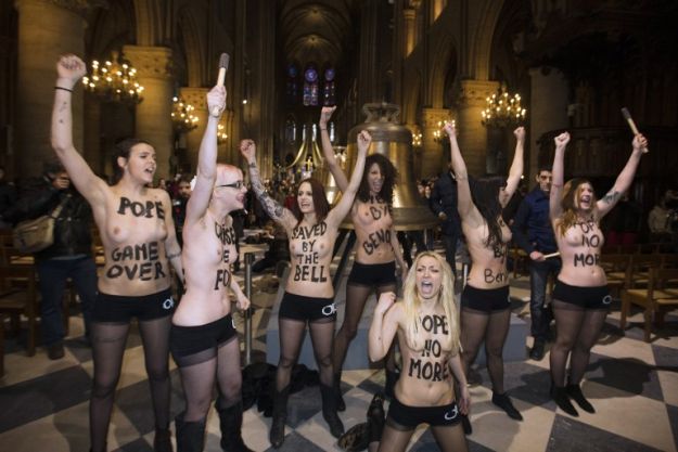 Осум феминистки денес одлучиле да ги покажат своите гради со што го прославиле заминувањето на Бенедикт Шенаесетти. Тие повлекувањето на поглаварот од католичката црква го славеле пред париската катедрала Нотердам.