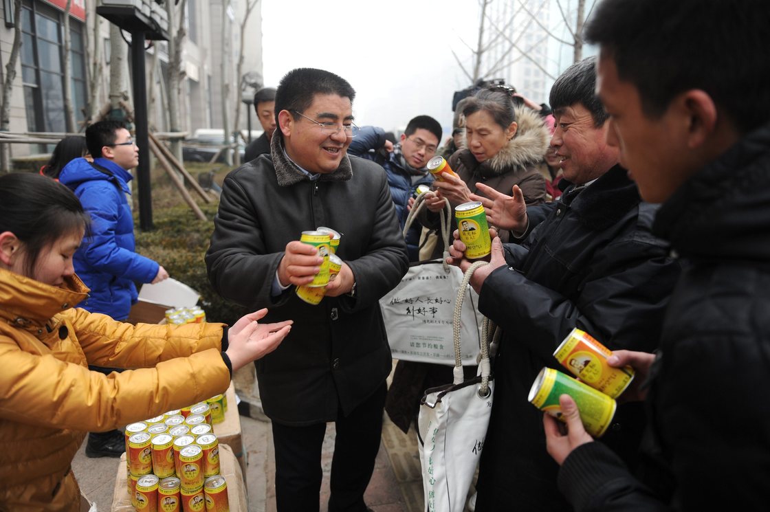 Chinese businessman Chen Guangbiao (center) gives cans of fresh air produced by his factory to passersby for free in a financial district in Beijing.