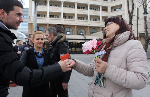 Младите од ВМРО-ДПМНЕ денес среде Скопје го одбележаа Денот на жената, 8 Март. Наместо цвеќиња на припадничките на понежниот пол им поделија пригодни подароци со мотивирачки пораки.