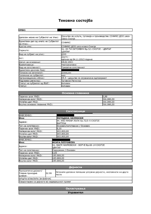 БТ Македонија ДООЕЛ е фирма во сопственост на друга фирма СОФИКС ДОО, а пак во таа фирма сопственици се Искра Петровска, прва братучеда на Радмила Шеќеринска и Мeтодија Наумовски, тетин на Шеќеринска и татко на Искра Петровска. Бизнисот без тендер од СЕП завршил кај братучедата и тетинот на Радмила Шеќеринска.