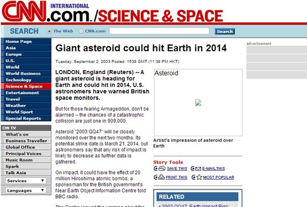 За два дена се подготвува пад на астероид на земјата најавуваат блогери ширум светот а информациите ги подгреваат CNN и агенцијата Ројтерс која што уште пред 11 години најавила дека во 2104 може да не удри џиновски астероид.